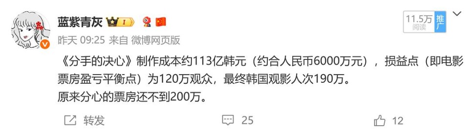 我看了之后惊讶《分心》在韩国的票房居然不高。依它在国际上的声誉, 让朴赞郁在戛纳拿了最佳导演奖,在韩国国内男女主角都拿了最佳演员,在中国也有非常高的谈论度,B站上拉片分析的视频有几十个,这样一部电影,韩国人居然不领情。他们哪里不满意啊,故事蛮好看的,毕竟戛纳都盖章了。汤唯他们不是也蛮喜欢的吗。于是在微博上发了一条: